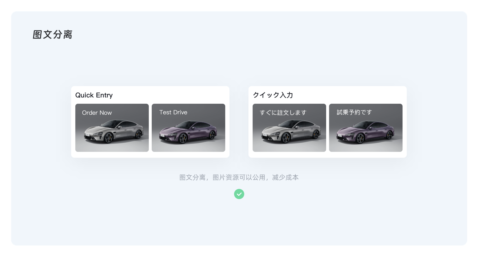 - 別在圖片里嵌文本:若圖片含 “立即下單”,每種語言需做一張圖,增加開發成本與 APP 體積;