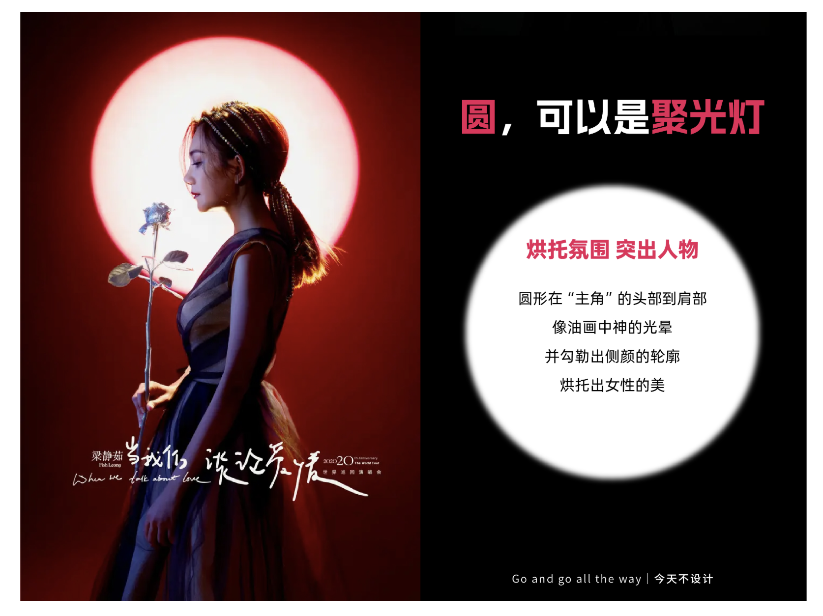 圓形最經(jīng)典的用法之一,是化作 “聚光燈”,在畫面中形成視覺焦點,同時烘托特定氛圍。這種設(shè)計邏輯源于現(xiàn)實中的光影體驗 —— 聚光燈的圓形光束能隔絕干擾,讓觀者注意力瞬間集中于核心主體,海報設(shè)計中便借用這一原理,通過圓形光影的明暗對比、輪廓勾勒,突出人物或關(guān)鍵元素,傳遞情緒基調(diào)。