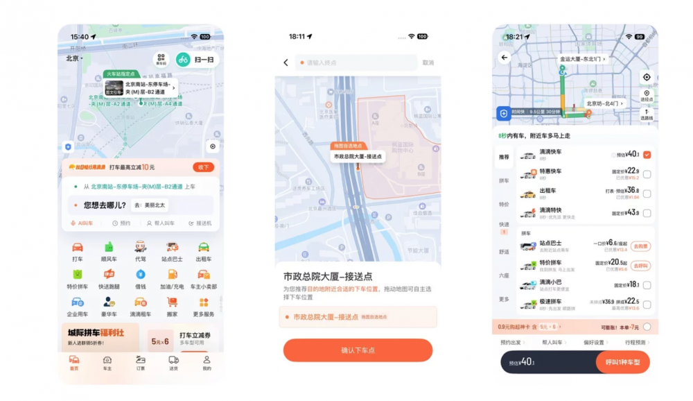 反觀滴滴國內版,排版的信息密度明顯更高。在有限的屏幕空間內,除核心叫車功能外,還疊加了活動提示、附加服務入口、優(yōu)惠信息等內容,排版相對緊湊但層級分明。通過卡片分區(qū)、字體權重區(qū)分等設計手法,在承載海量信息的同時,保證用戶能快速定位所需功能,滿足國內用戶 “一次打開、多點獲取” 的使用習慣。