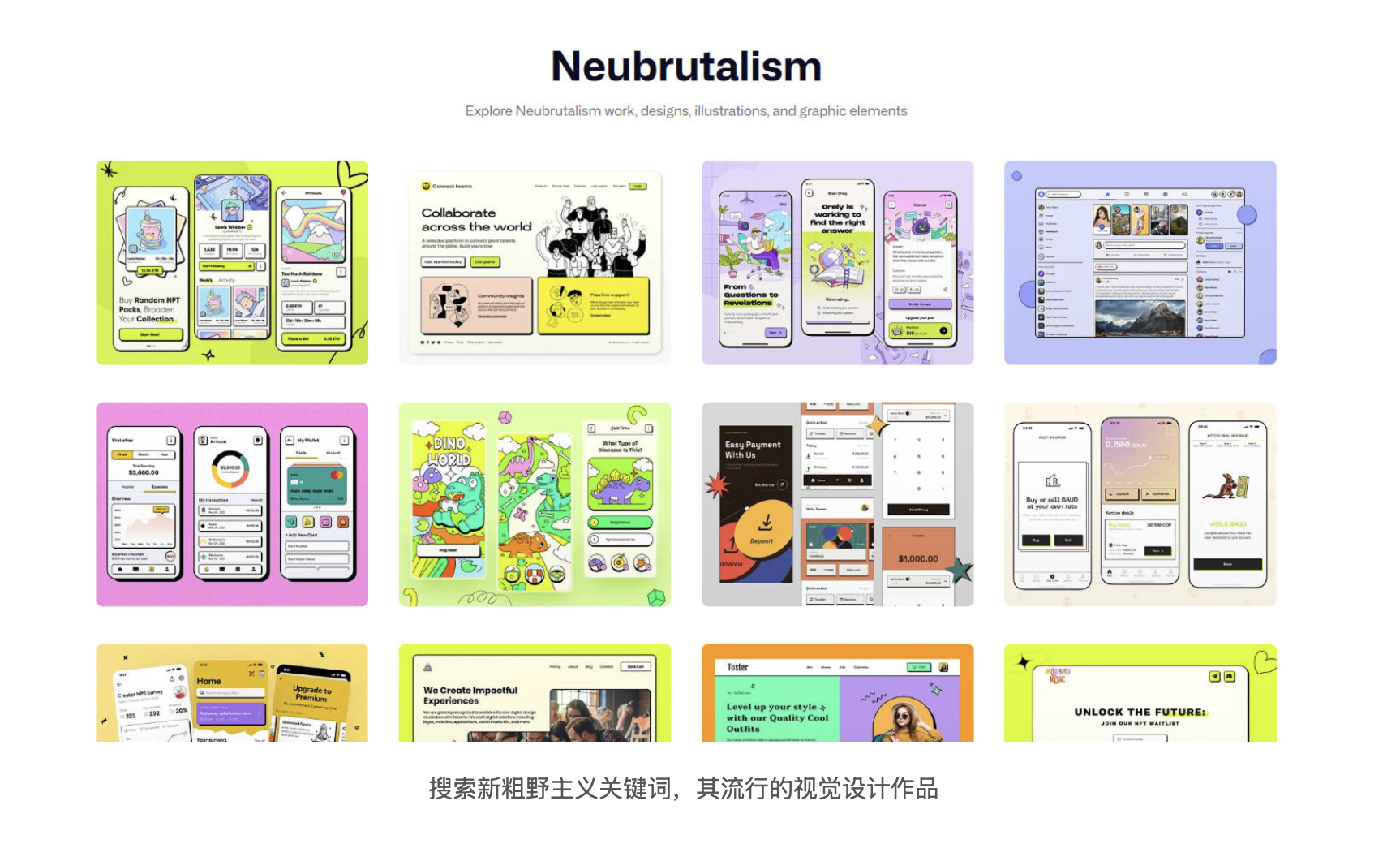 作為數字設計領域的 "叛逆者",新粗野主義的風格特點極具辨識度。在視覺呈現上,它追求極致的直接性:字體往往選擇粗黑、夸張的樣式,成為畫面的視覺核心;插圖和動畫多采用強烈的視覺化風格,主題多元且充滿張力;界面設計摒棄冗余信息,以最直白的方式呈現核心功能,哪怕犧牲部分 "易用性",也要堅守 "功能大于形式" 的原則。這種 "反 UX" 的交互體驗,看似違背設計常理,實則是對過度設計的反叛 —— 它拒絕用精致包裝掩蓋本質,讓設計回歸最原始的溝通功能。