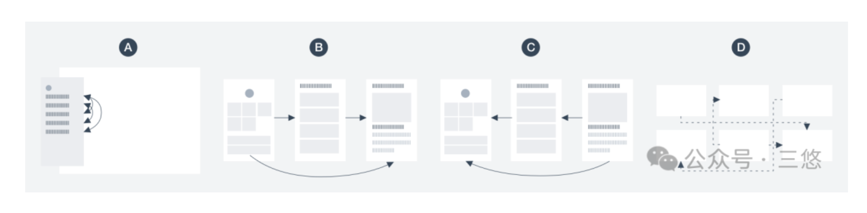 完善的導航體系應支持四種核心路徑移動:同層級跳轉(zhuǎn)(平移)、進入低層級內(nèi)容(下鉆)、返回歷史頁面或高層級(返回)、基于相關(guān)性推薦(聯(lián)想導航),四種路徑相互配合,覆蓋用戶的所有操作場景。