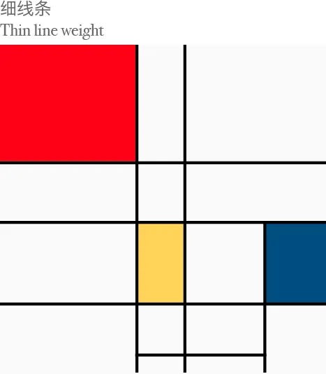 serif字體本身的線條的粗細變化和平衡就跟中國書法一樣,好的書法作品是不可能每條線都一樣粗細,一定是交織的平衡。人類的視覺本身對不同線寬的交錯就有著美的感覺。比如下圖最左邊是蒙德里安在”新造形主義”﹝Neo-Plasticism﹞里的作品,其中每個交叉的線條都有著不同的粗細。如果將同樣這幅畫的線條變成同等粗細,那這件作品的性格就淡了。同樣根據人自然的審美觀,細線條比粗線條要美,比較第二和第三張就能看出來
