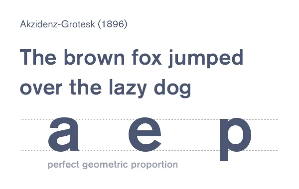 Akzidenz-Grotesk 起于1896年,受到很多字體的影響,從Baskerville, Garamond和Carlson中繼承了幾何比例的影響,將其發(fā)展到了新的一級。當代的Akzidenz-Grotesk字體遺傳于20世紀50年代后期,它已經是被擴大后的字體族,這些風格到后來啟發(fā)了更加現代的Helvetica,和Univers。