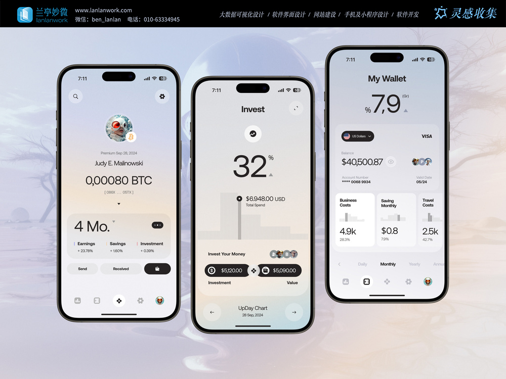 - 核心設計亮點:用大字體突出關鍵數據(如收益率、資產總額),搭配極簡的圖表和卡片式分類,讓財務狀況一目了然。