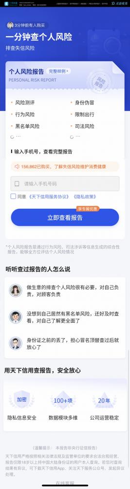 這是一個用于查詢個人信用與風險報告的落地頁,風格偏向專業可信。