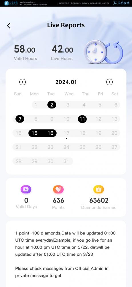 - 核心設計亮點:頂部用大數字展示核心指標(有效時長、直播時長),下方日歷可快速切換日期查看對應數據,操作直觀。