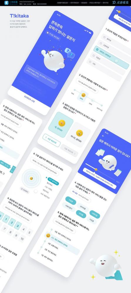 這是一款韓國風格的問卷類應用,以友好的藍色為主色調,搭配可愛的 3D 卡通形象引導用戶完成問卷。