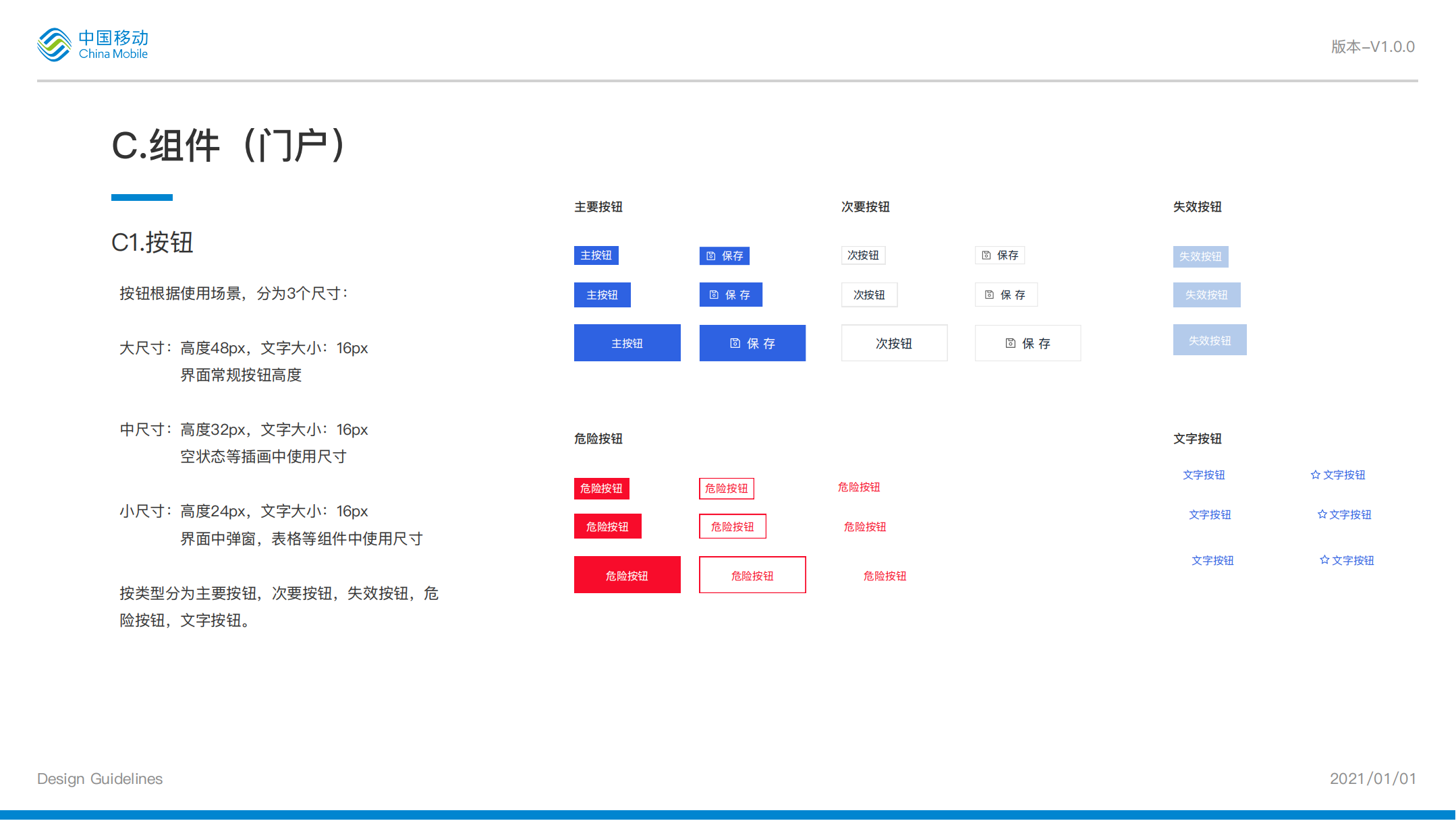 按鈕有 5 個狀態:正常、點擊、懸停、加載、禁用。需要在規范中分別羅列出這五個狀態,標注上對應的按鈕填充色、邊框色、圓角值、按鈕寬度和高度,按鈕文本大小、顏色值。如果是圖標按鈕的話,除了上述參數值以外,還需要標注 icon 和按鈕文本之間的間距,icon 圖標的大小。