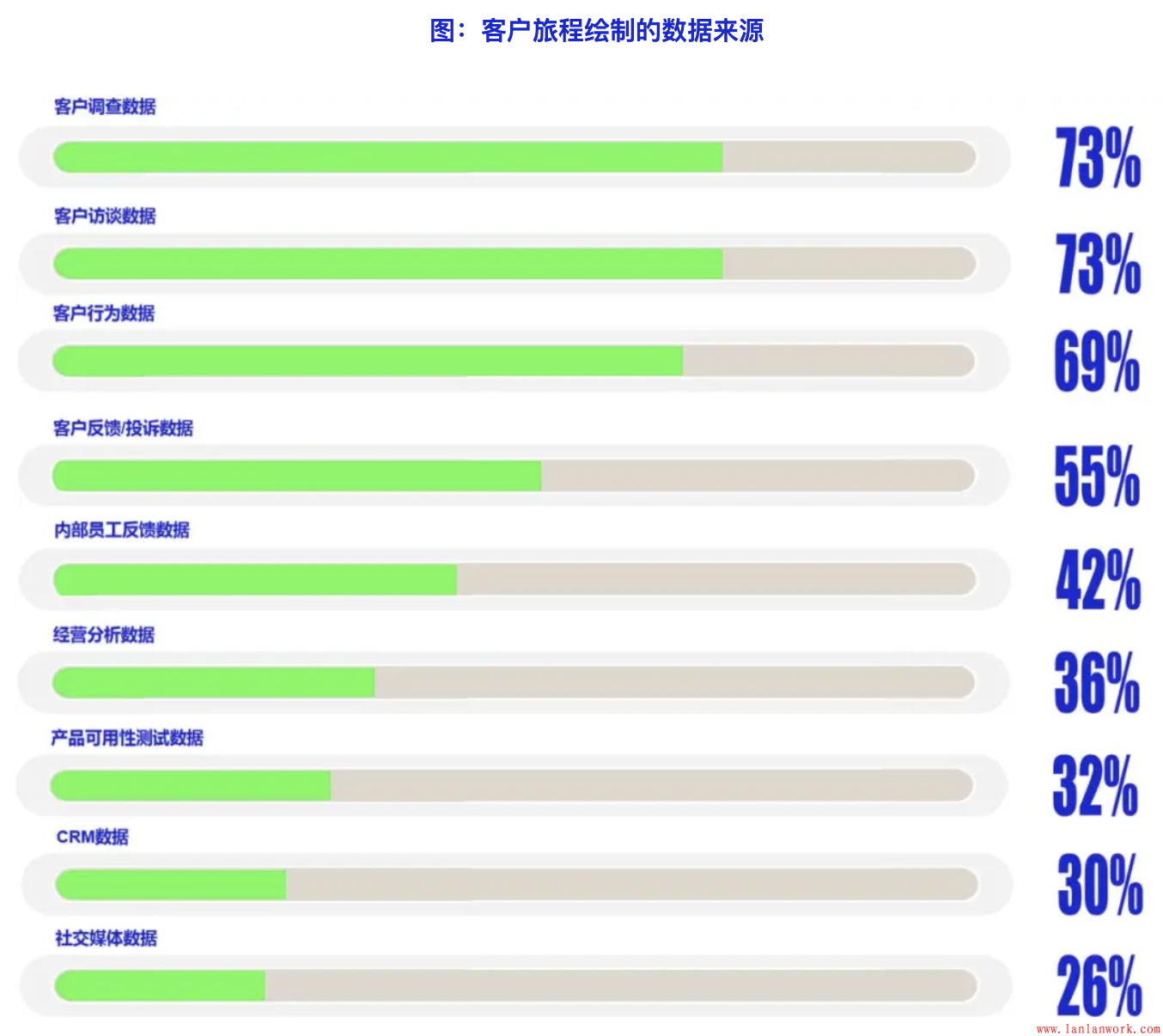 在繪制客戶旅程的過程中,目前主要用的是客戶調查數據和客戶訪談數據,這也是客戶研究團隊最擅長和最容易采集的數據。其次最常用的數據來源是客戶行為和客戶反饋/投訴數據,總體上對外部數據應用多于內部數據,對小數據多于大數據。