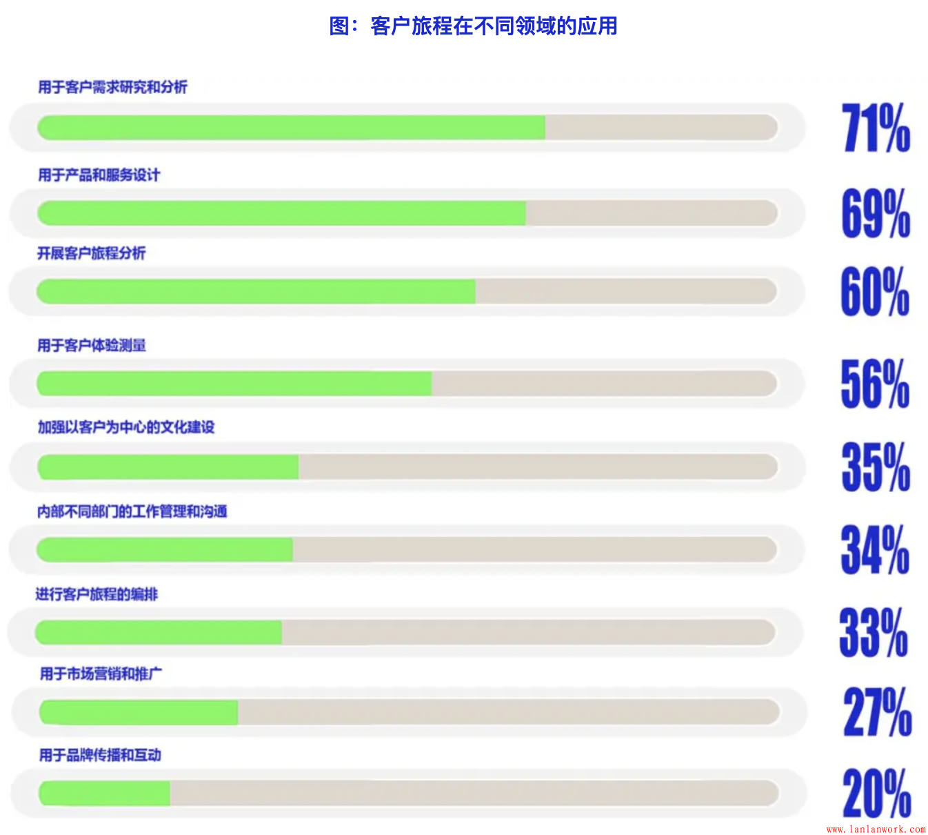在將客戶旅程方法進行具體應用時,最常見是用于客戶需求分析、產品和服務設計、客戶旅程分析和測量。其次是在企業文化建設、工作管理和溝通方面的應用。在具體操作層面,例如客戶旅程編排、營銷和互動,目前也有一定比例的具體應用。隨著客戶旅程方法應用的進一步深入,直接到操作層面的應用將逐步提升。