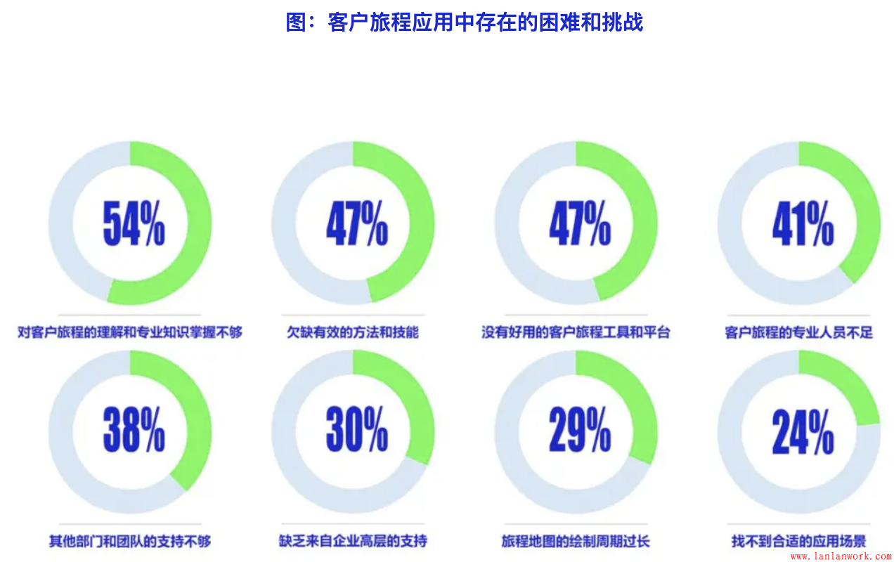 客戶旅程在不同領域的應用對最終的效果有明顯的影響:表示客戶旅程應用效果一般的企業在各個具體應用領域的應用比例均低于獲得明顯效果的企業。效果一般的企業在客戶需求研究和分析、客戶旅程編排、市場營銷和推廣,以及品牌傳播與互動方面的應用差距最大(落后超過10%的比例)。從調查數據來看,雖然用于編排、營銷和品牌的總體比例不高,但確實影響最終應用效果的顯著因素。