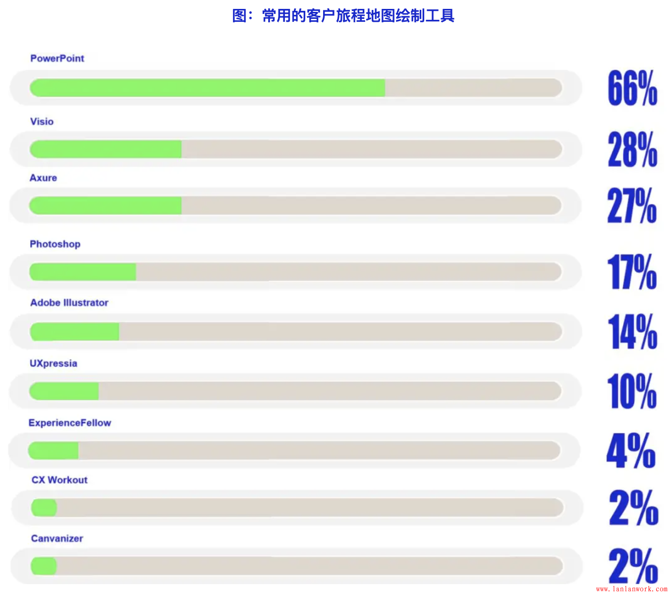 在客戶旅程地圖繪制工具方面,使用最多的是PowerPoint,處于絕對領先的地位;其次是常用的繪圖和設計工具,例如Visio、Photoshop、Adobe Illustrator等;專用的客戶旅程地圖繪制工作使用比例非常低,最主要的客戶旅程地圖專用繪制工具UXpressia的使用比例也只有10%,其他的則更低,使用比例只有2%-4%。主要是目前客戶旅程地圖繪制并不是一項常見工作,所以通用型的文編編輯和繪圖工具會是常用選擇,而目前的客戶旅程地圖繪制工具多為英文版本,國內還沒有出現較好的客戶旅程地圖繪制工具,這也是客戶旅程地圖專用工具使用比例較低的重要原因。