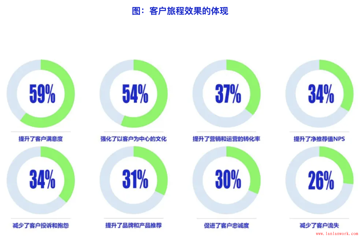 通過以上在不同領域的應用,客戶旅程方法在各個方面的效果都有所體現,尤其是在提升客戶滿意度、強化以客戶為中心的企業文化、提升營銷和運營的轉化率方面最為明顯,分別由59%、54%和37%的企業表示在這三個方面得到了提升。