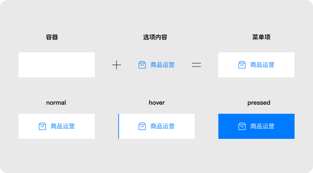 導(dǎo)航菜單是由多個菜單項(xiàng)集合組成的。菜單項(xiàng)由容器+選項(xiàng)內(nèi)容(圖標(biāo)+文字或文字)組成,交互行為是點(diǎn)擊菜單熱區(qū)后跳轉(zhuǎn)到相應(yīng)目標(biāo)頁面。