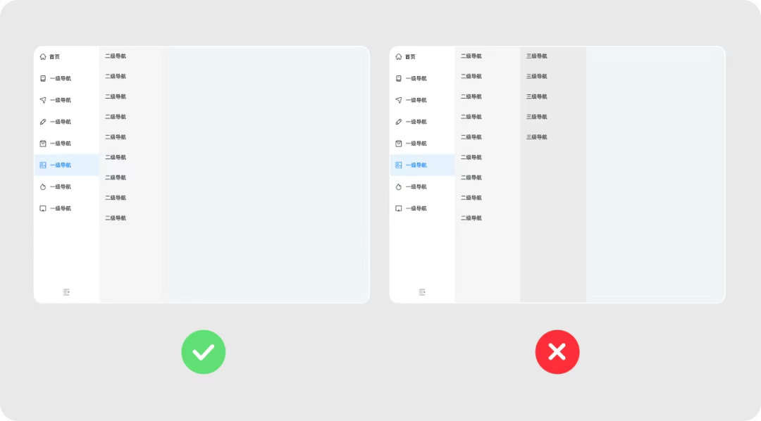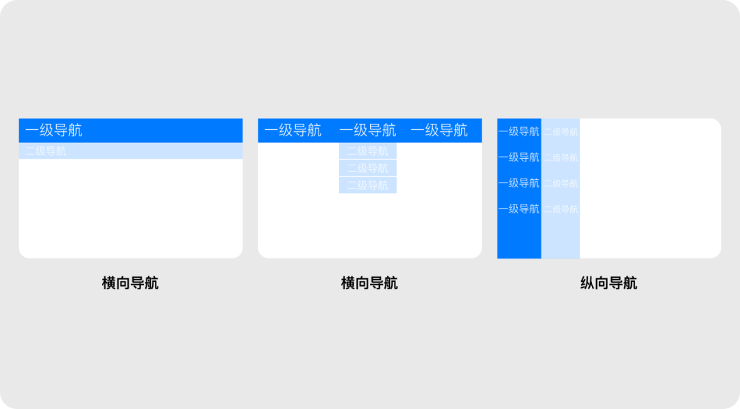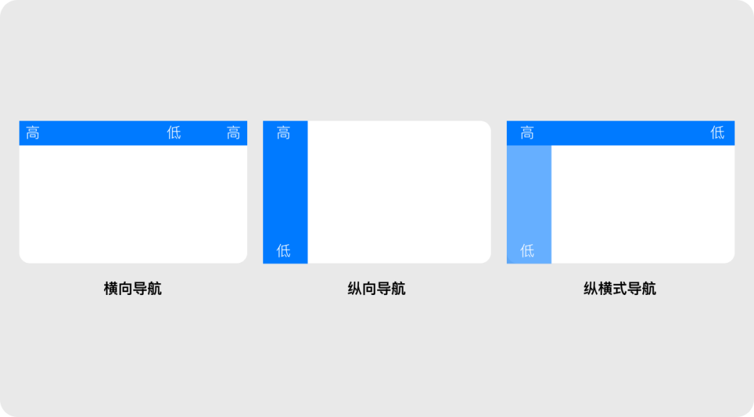 同時使用橫向和縱向?qū)Ш?,通常橫向?qū)Ш绞且患墝?dǎo)航,用于展示全局類目和功能;縱向?qū)Ш綖槎墝?dǎo)航,提供具體的功能和內(nèi)容。