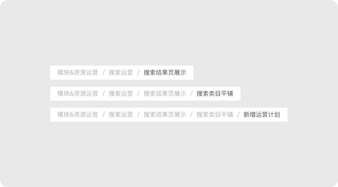 當(dāng)層級大于2個時,可以利用面包屑導(dǎo)航,用戶可以根據(jù)面包屑導(dǎo)航看到當(dāng)前操作的位置和軌跡,并且方便返回到任意位置。
