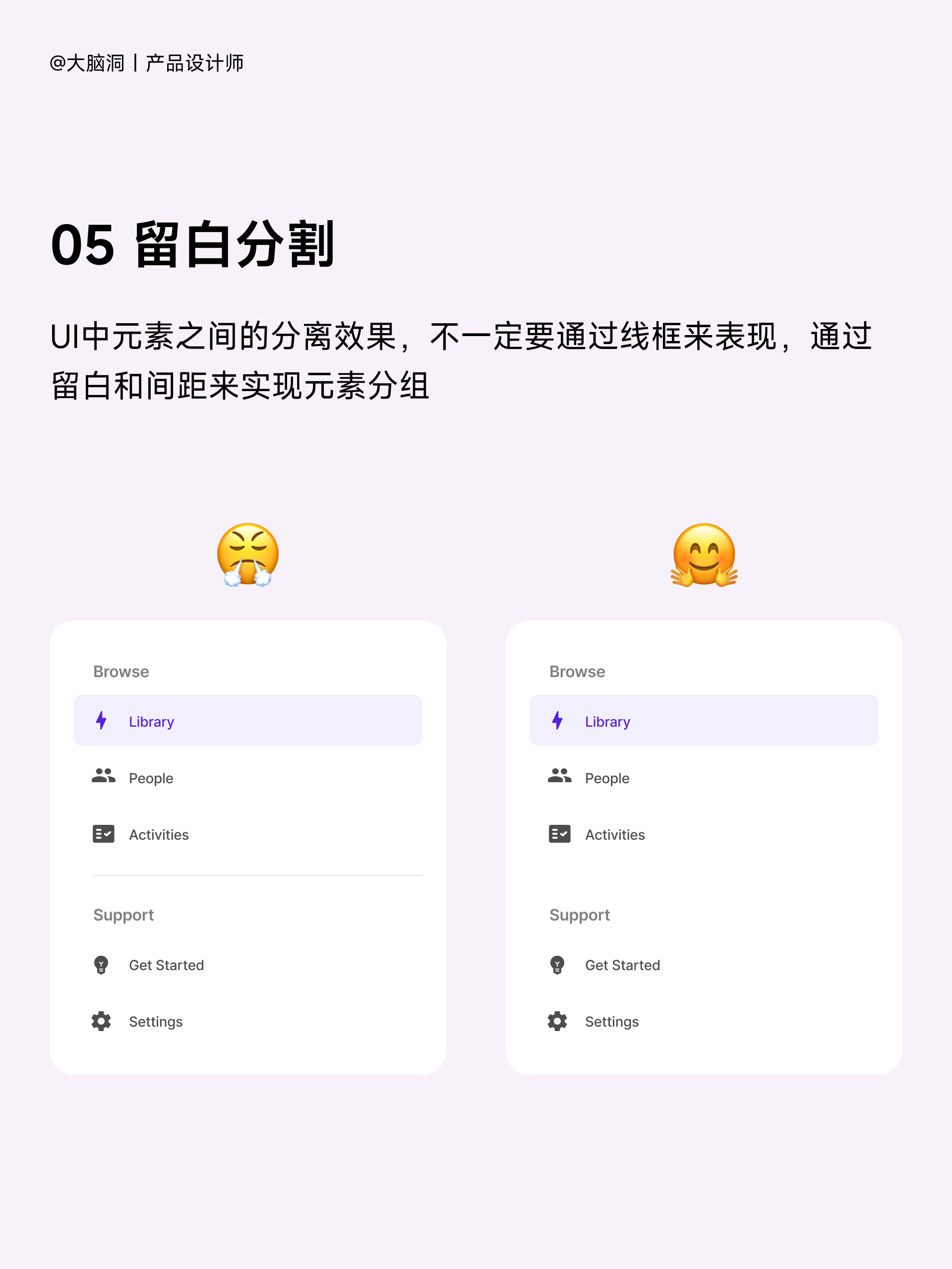 2)組織:組織必須提供的功能。在視覺層面上,做到信息分層清晰;在產(chǎn)品層面上,做到根據(jù)內(nèi)容做功能分組,讓用戶更方便查閱和尋找。分塊越少,選擇越少,用戶負(fù)擔(dān)就越小。